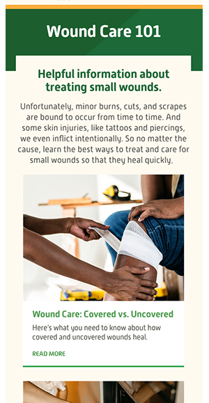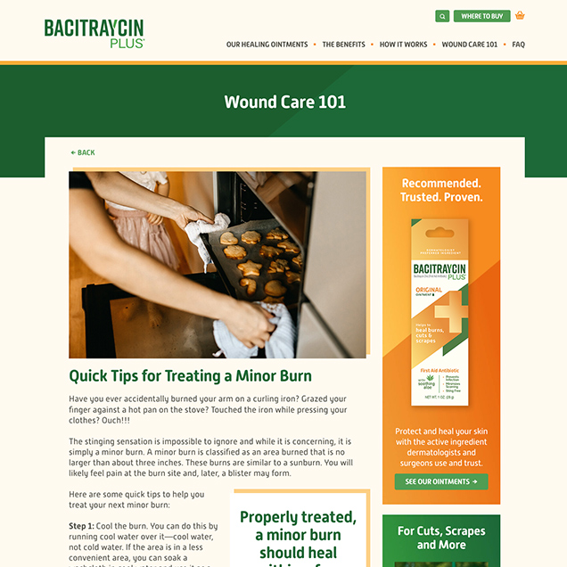 Because Bacitraycin Plus is a multi-purpose ointment, we created a series of evergreen blog posts to highlight a variety of use cases, from minor burns to tattoo aftercare to skinned knees, which have helped attract significant organic search traffic.
