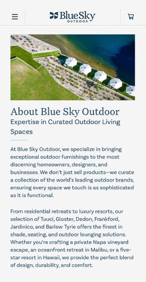 Along with the new website, we also created a new logo for BlueSky Outdoor. Elegant typography and soothing colors reflect their upmarket positioning, while the optional logo mark evokes a fluttering canopy in a gentle breeze.