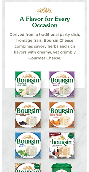 First made in Northern France over 50 years ago, Boursin combines savory herbs and rich flavors in a creamy, yet crumbly gourmet cheese that’s extremely popular among those who love to entertain.