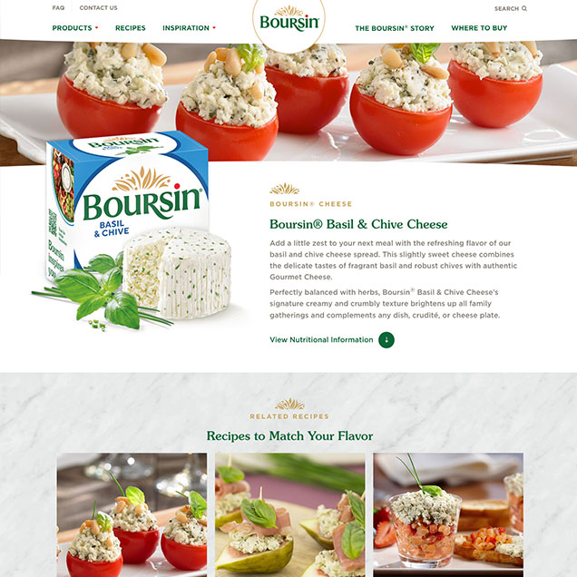 Boursin Cheese is available worldwide, but each country has a significantly different lineup of products and flavors. We architected this site for maximum flexibility in terms of product ranges and varieties, so that the base templates could be localized for each market. In some countries, the website even supports multiple languages.
