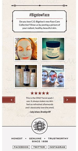 Combined with other marketing efforts, such as social, e-mail, a home page takeover, and more, this landing page helped to drive considerable traffic to the C.O. Bigelow e-commerce site. Not only did several products in the Face Care collection become instant best-sellers, but other products under the overall brand umbrella enjoyed sales bumps as well.