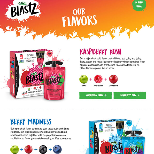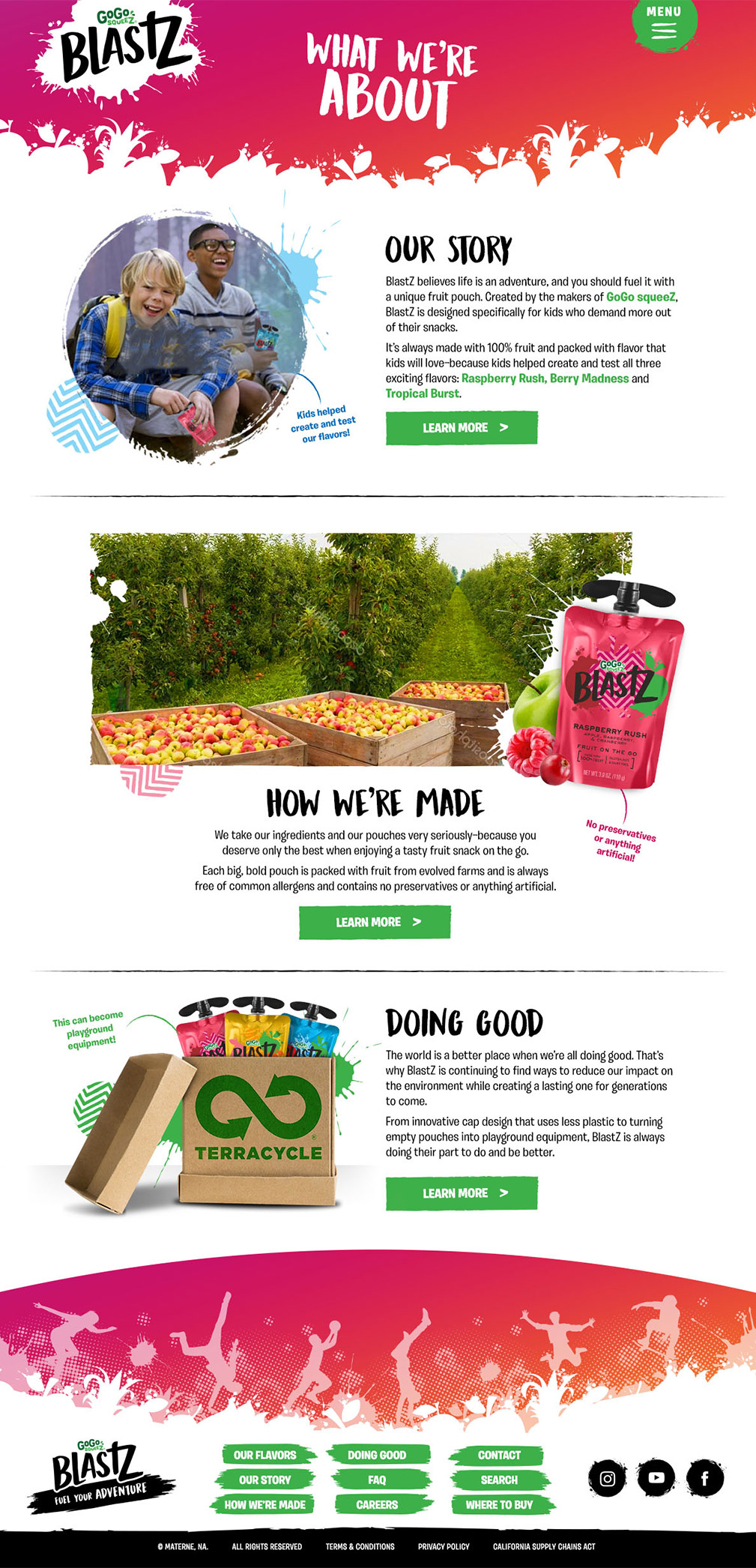 Though BlastZ was conceived to be a separate brand from GoGo squeeZ, it still needed to embody the core values of the parent brand. These include real ingredients, no icky stuff, and an earth-friendly partnership with TerraCycle. We included all of these attributes on the BlastZ site, but presented them in a more mature way appropriate for the brand’s target market.