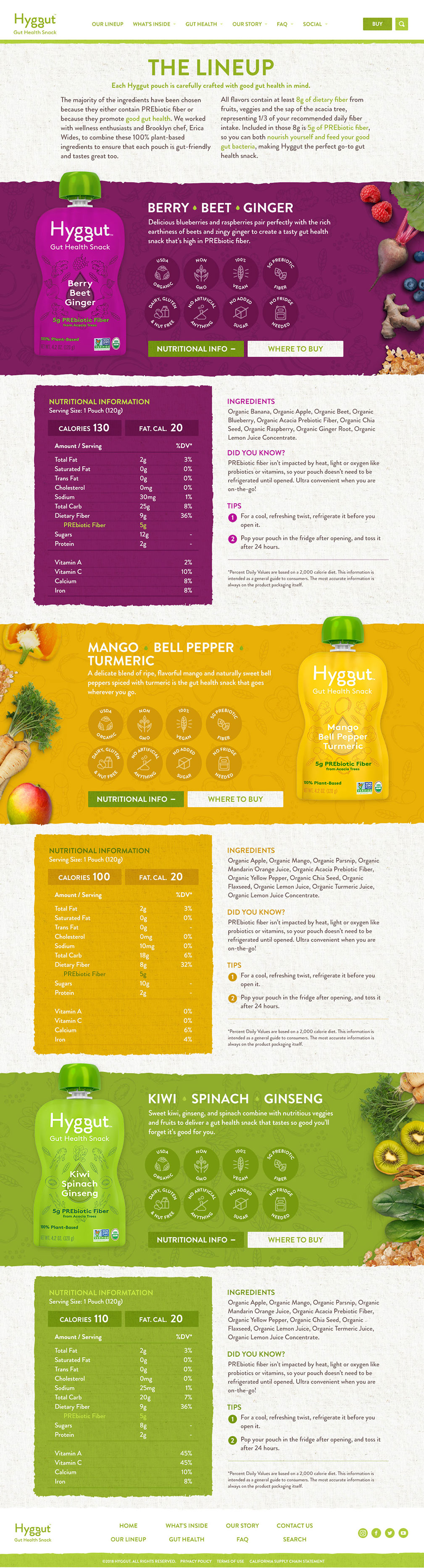 The name was a stylized riff on the Danish word ‘Hygge’ which describes cozy contentment. The ingredients included spinach, beets, bell peppers, and other things not traditionally associated with snack foods. But the product truly tasted great, so we focused a lot of our effort on this website towards inspiring trial and helping people open their minds to something radically new. Unfortunately, Hyggut was simply ahead of its time.