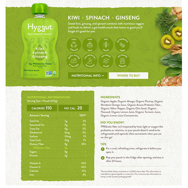 The name was a stylized riff on the Danish word ‘Hygge’ which describes cozy contentment. The ingredients included spinach, beets, bell peppers, and other things not traditionally associated with snack foods. But the product truly tasted great, so we focused a lot of our effort on this website towards inspiring trial and helping people open their minds to something radically new. Unfortunately, Hyggut was simply ahead of its time.