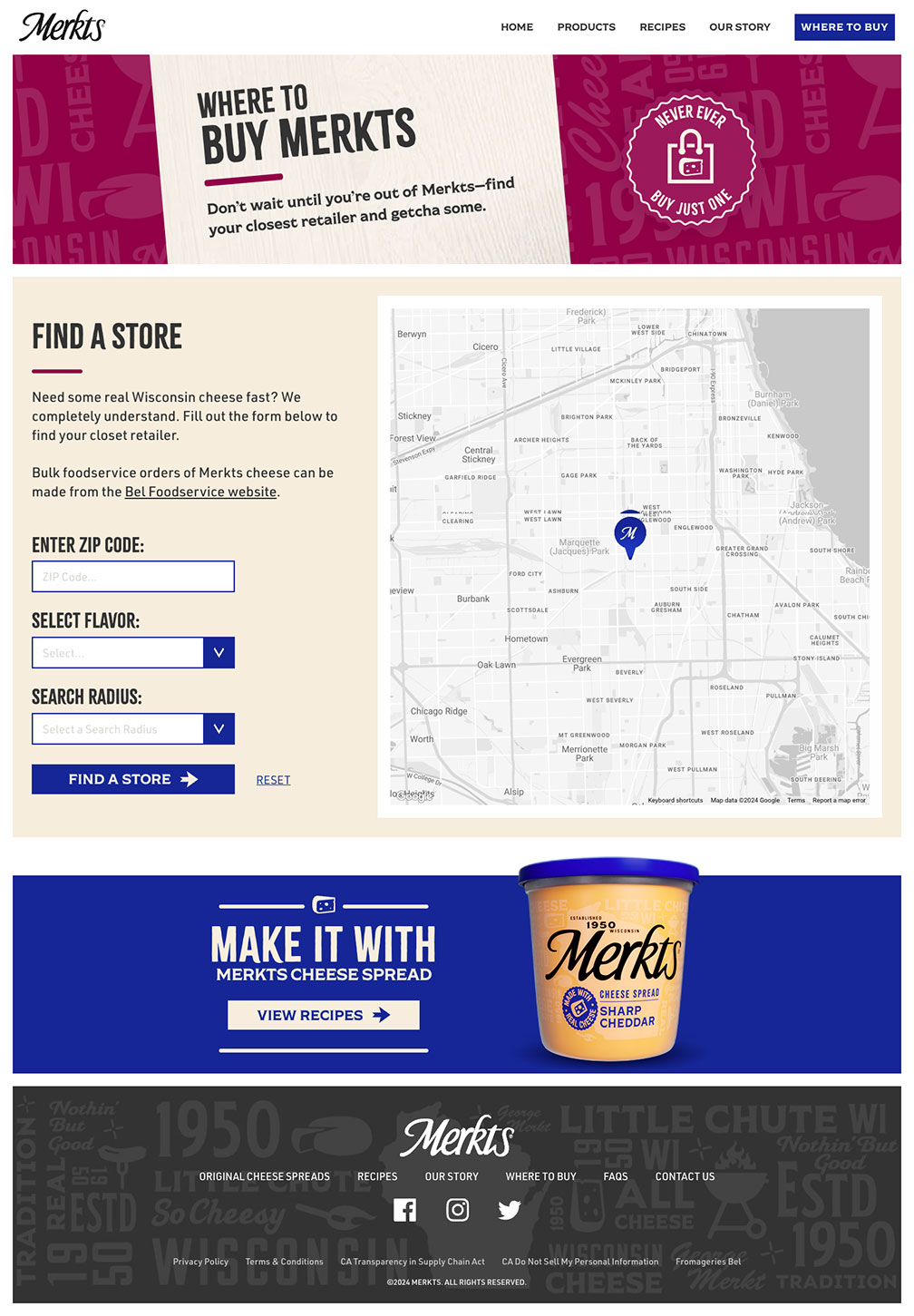 Though born in Wisconsin and an established tradition in the upper Midwest, Merkts has only recently begun to enjoy a measure of nationwide popularity. To help consumers locate this delicious cheese spread at their local grocer, we built a custom store finder tool which integrates retail scanner data provided by Emplifi with mapping tools provided by Google.